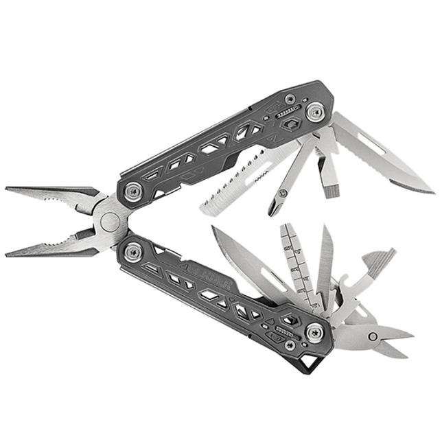 Funkciók: félkerekcsőrű fogó, kombinált fogó, drótvágó, sima élű penge, recézett penge, olló, fűrész, kereszt csavarhúzó, kis, közepe és nagy lapos csavarhúzó, konzervnyitó, üvegnyitó, ár, reszelő, vonalzó, kábelcsupaszító.